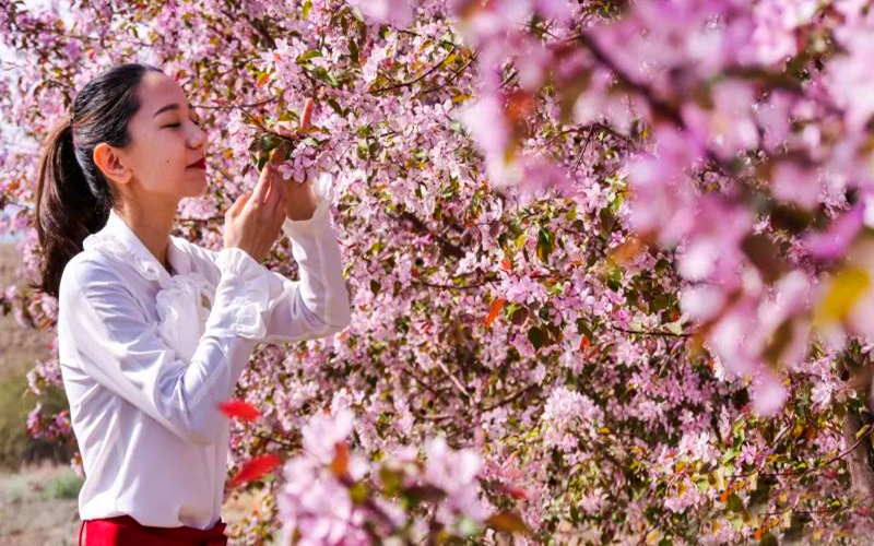 「五一」假期,遊客在博樂市萬畝海棠生態園聞香識海棠。圖片來源:石榴雲新疆日報 通訊員夏特克 攝