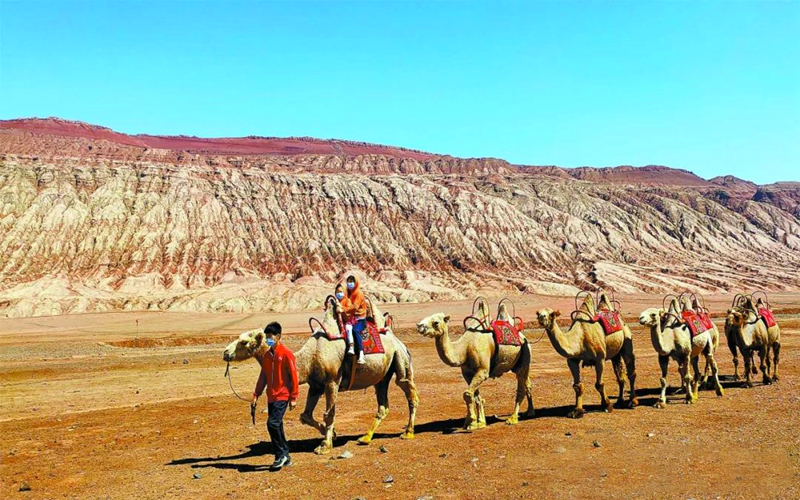 4月30日,遊客在火焰山景區騎駱駝遊玩。圖片來源:石榴雲新疆日報 劉健 攝