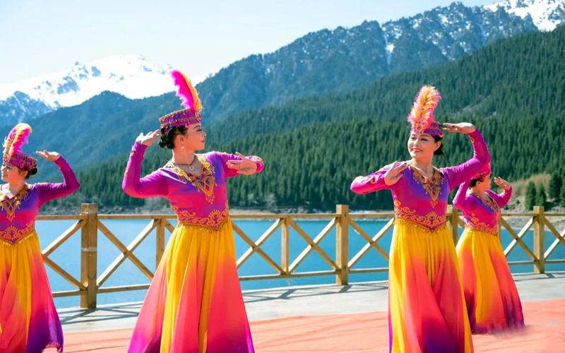 4月30日,天山天池景區第三屆「開湖節」開幕,精彩的文藝表演在湖畔上演。圖片來源:玩轉天山天池