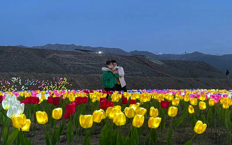「五一」假期,遊客夜遊獨山子大峽谷,感受絢爛多彩的鬱金香花海。圖片來源:獨山子旅遊