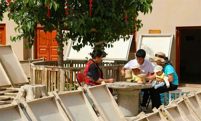 「五一」假期,墨玉縣普恰克其鎮桑皮紙一條街受到遊客的熱捧。圖為遊客在這裏體驗桑皮紙製作。圖片來源:墨玉縣融媒體中心