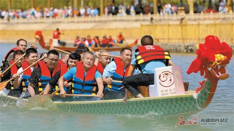 6月3日,博湖縣舉行龍舟賽活動,來自當地10支代表隊的百名龍舟健兒在博斯騰湖上演一場水上「速度與激情」。圖片來源:石榴雲新疆日報 年磊 攝