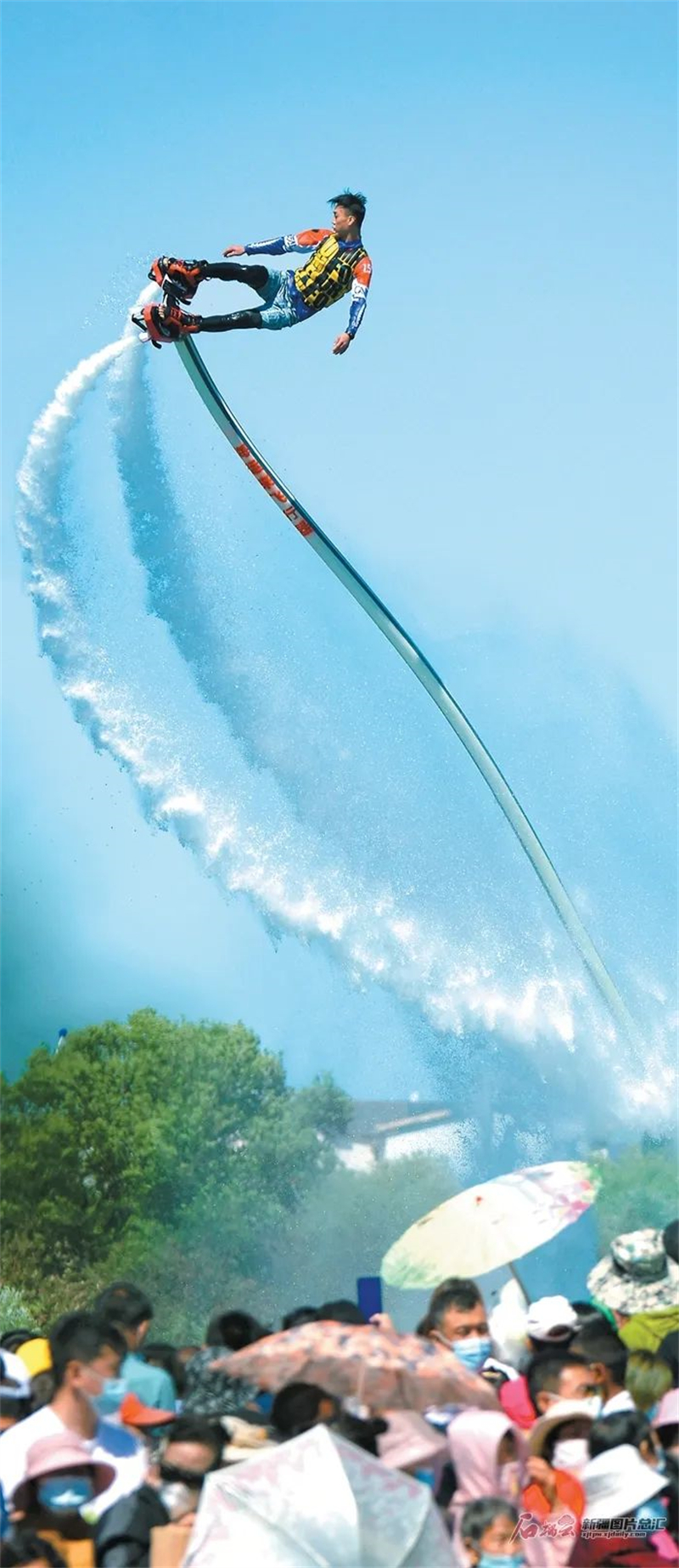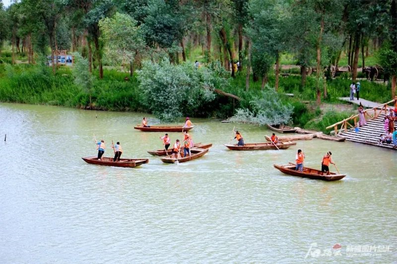 6月3日,遊客在觀看「水上飛龍」表演。端午假期,新疆生產建設兵團第十二師222團舉辦的端午龍舟文化旅遊節,吸引了眾多遊客前來遊玩。圖片來源:石榴雲新疆日報 王志清 攝