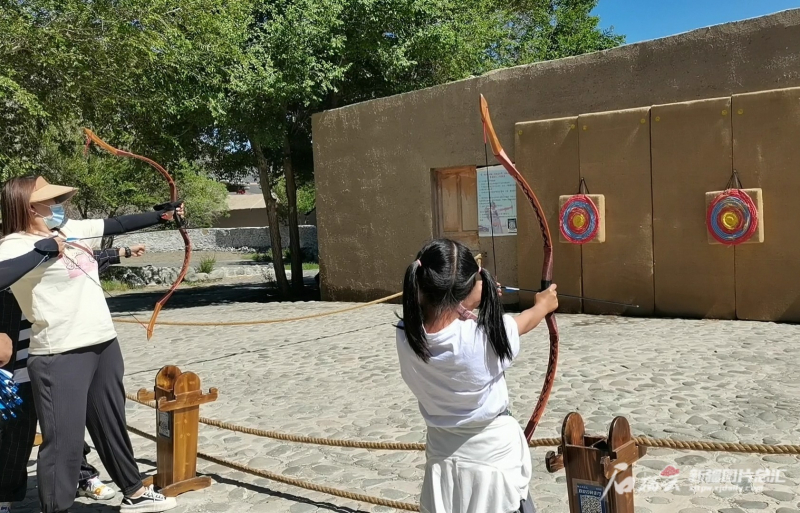 3日,遊客在達坂城古鎮景區體驗射藝。圖片來源:石榴雲新疆日報 記者李莉 攝