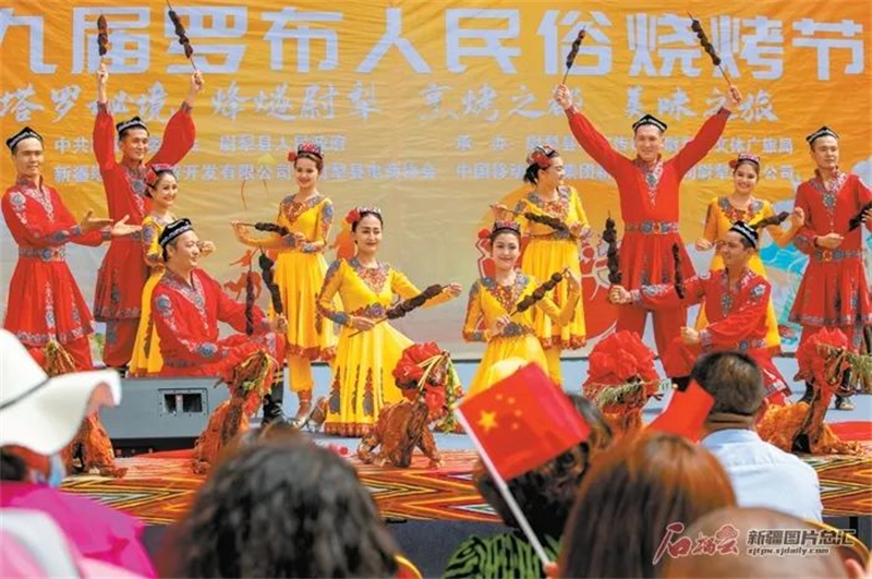 6月3日,演員在表演舞蹈《天下羊肉尉犁香》。端午假期,尉犁縣第九屆羅布人民俗燒烤節吸引了眾多遊客前來品美食、觀演出,樂享假日時光。圖片來源:石榴雲新疆日報 龐博 攝