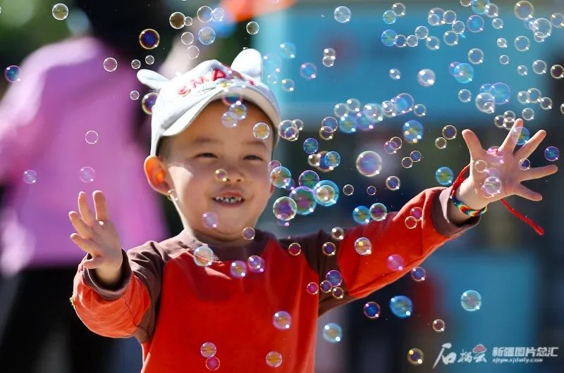 6月3日,小朋友在夜市上追泡泡玩。當日,木壘哈薩克自治縣英格堡鄉月亮地村開展慶端午活動,精彩的文藝演出、夜市上品美食,樂享假日時光。圖片來源:石榴雲新疆日報 記者李瑞 攝