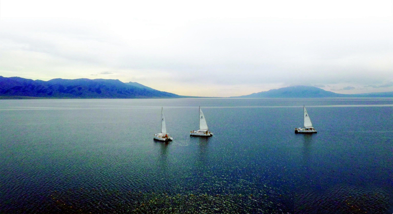 遊客乘帆船在賽裏木湖遊覽(5月19日攝)。 石榴雲/新疆日報記者周鵬攝
