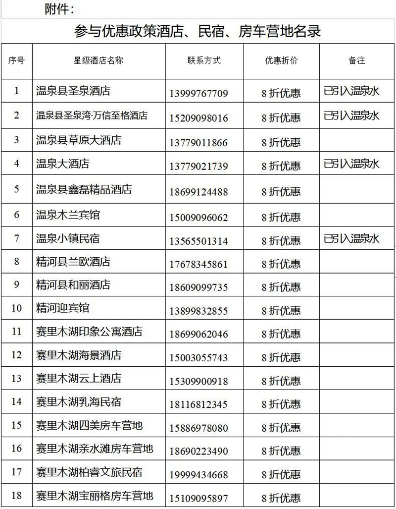 (三)組團住宿補貼政策。旅行社組織遊客遊賽裏木湖景區後,並在溫泉縣安排住宿,可獲得每晚每間房50元補貼(全年執行此政策)。