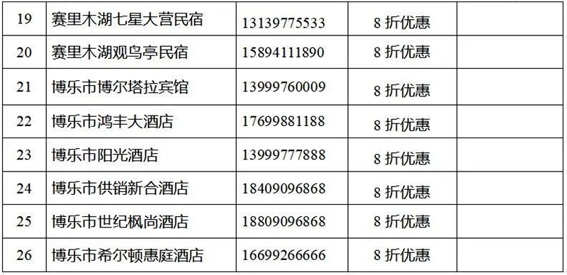 入住博州指定酒店享受門市價8折優惠;凡入住賽裏木湖景區所有酒店、房車營地、民宿享受門市價8折優惠(名單後附)。