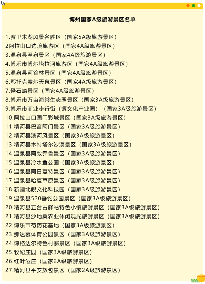 1.景區門票優惠政策。博州賽裏木湖景區、怪石峪景區、溫泉縣五館一中心面向全國遊客實行門票8折優惠(特殊人群按照相應政策享受優惠)。其他A級景區免費向遊客開放(景區名單附後)。