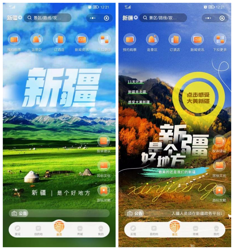 作為新疆文旅服務官方總入口,「遊新疆」平台在一部手機遊新疆的基礎上,以微信小程序為核心載體,打造一個由自治區級、14個地州、500餘家景區和N個文旅企業構成的服務體繫,將豐富的旅遊資訊、個性化產品、前沿化科技進行多維度立體化整合,為遊客提供「吃、住、行、遊、購、娛」全要素智慧文化旅遊服務,形成預約購票、酒店預訂、電子導覽、遊玩攻略、旅遊投訴等一站式服務能力,讓遊客無需下載、安裝和存儲,即刻享受「掃碼即達」的新疆之旅。