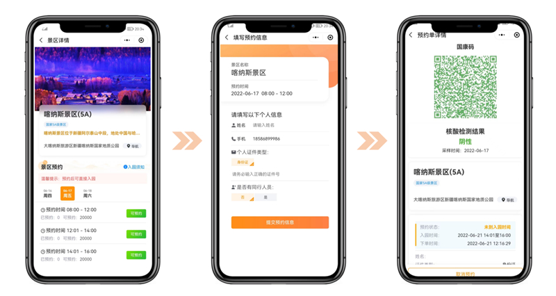 在疫情防控常態化背景下,新疆聯通率先通過「遊新疆」平台打通了預約碼、國康碼、核酸檢測結果,實現了「三碼合一」,遊客可通過一鍵預約景區同時顯示出國康碼及核酸檢測狀態,簡化了遊客入園流程。