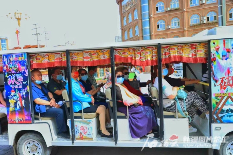 7月2日,遊客坐着旅遊觀光車在喀什古城遊覽。石榴雲/新疆日報記者 韓沁言攝