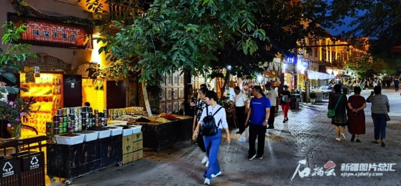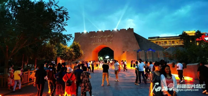 「不到喀什,不算到新疆;不賞夜景,不算看全新喀什。」輕快的鼓點響起,白日的「風情」在燈光的裝點下熠熠生輝,夜晚的喀什正以其獨特的魅力吸引着遊人。(石榴雲/新疆日報/記者 韓沁言)
