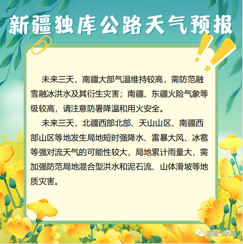 4.氣象部門提示,由於天氣變化存在不確定性,遊客請關註最新天氣預報預警信息,合理安排好旅遊和出行計劃。目前正處在旅遊季節高峰時段,進山遊客要特別註意山區天氣變化,根據天氣情況合理安排出行路線,遊客可關註新疆氣象局微信公眾號,及時獲取獨庫公路天氣信息。