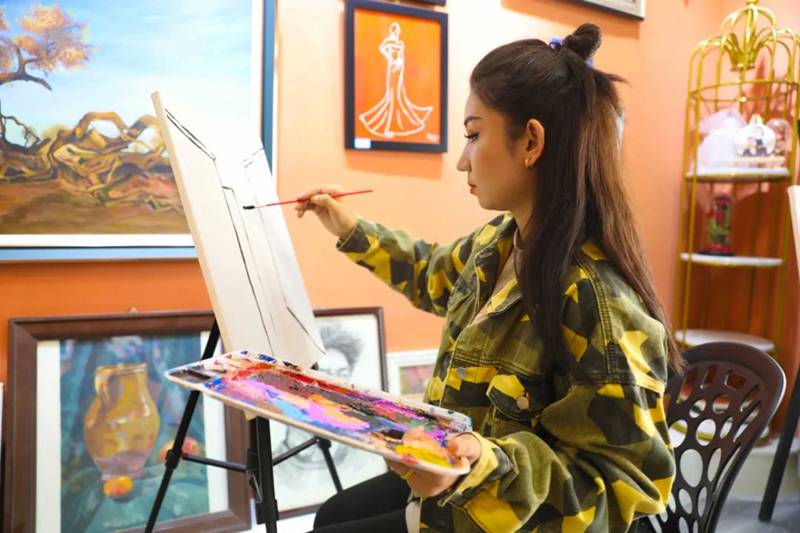 喀什古城吾斯塘博依路的油畫街是專門為油畫愛好者打造的文藝街道,街區乾淨整潔、古樸典雅、藝術氛圍濃厚,是展示繪畫技藝、展現才華的理想之地,也是喀什古城內新的網紅打卡地,目前油畫街已有30餘家畫廊入駐。