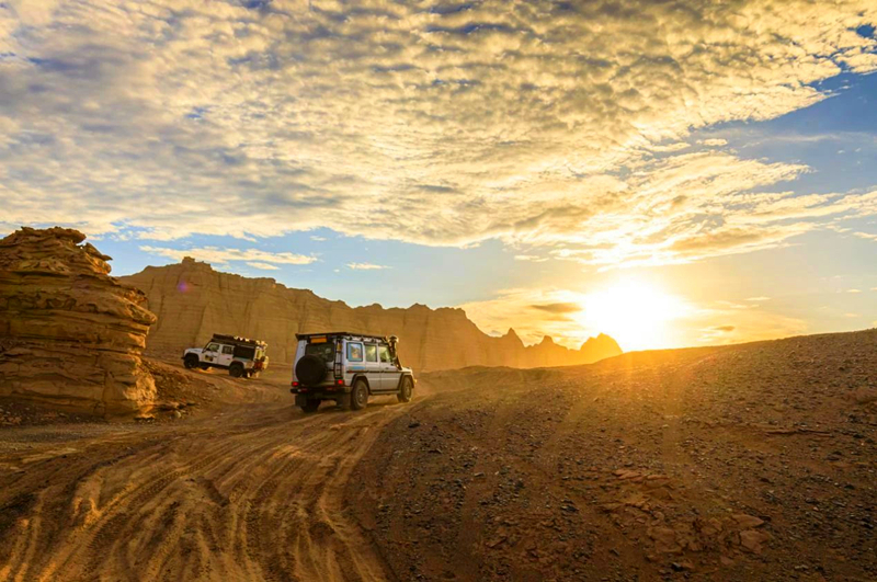 02 建議請專業領隊,從哈密出發,沿哈羅公路(S328省道)行駛至38公裏處,向右拐,一直向西,經過哈密瓜早熟基地南湖鄉,一路上都是軟沙戈壁河道,還有胡楊林、沙漠、雅丹等,沿途地形豐富風景多樣,然後一路穿行到達魔鬼城,沿着魔鬼城通往大海道的公路,第一個景點紅柳灘便出現在大家眼前,從紅柳灘一路行駛便可進入到大海道核心區,最後從了墩返回哈密市區。