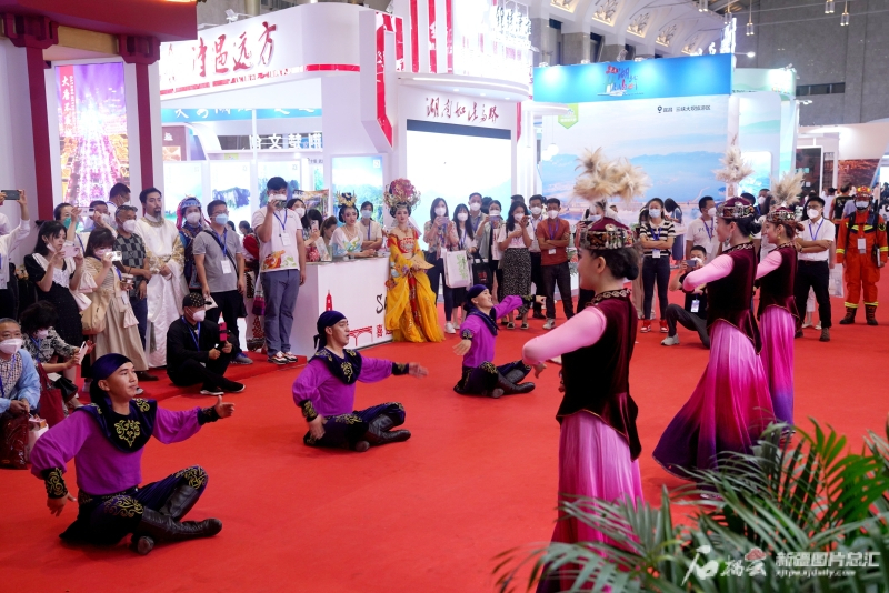 7月22日,在2022中國國際旅遊交易會開展首日,新疆演員表演的舞蹈吸引了很多觀眾圍觀。石榴雲/新疆日報記者張萬德攝