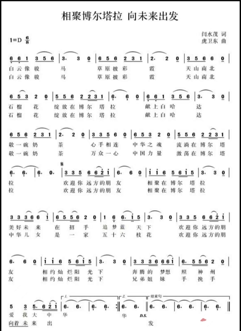 「白雲像駿馬草原披彩霞天山南北石榴花綻放在博爾塔拉……歡迎你遠方的朋友相聚在博爾塔拉美好未來在招手追夢藍天下歡迎你遠方的朋友相約燦爛陽光下奔騰的夢想照神州愛我大中華……」主題歌節奏明快,歌詞朗朗上口,激昂奮進,情真意切,具有鮮明的時代特點和濃郁的民族特色。