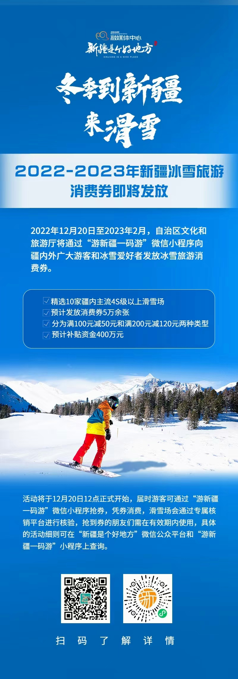 2022年12月20日至2023年2月,新疆維吾爾自治區文化和旅遊廳將通過「遊新疆一碼遊」微信小程序向疆內外廣大遊客和冰雪愛好者發放冰雪旅遊消費券。精選10家疆內主流4S級以上滑雪場,預計發放消費券5萬余張,補貼資金400萬元。