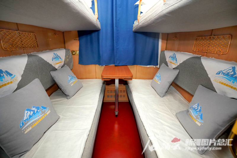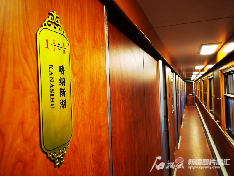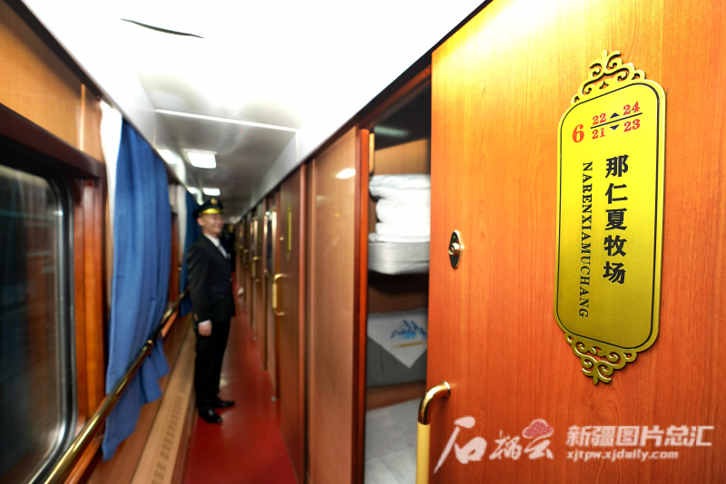 12月26日,「中國雪都·阿勒泰號」冰雪遊列車的卧鋪車廂裏,包廂名稱均來自阿勒泰當地知名景點名稱。石榴雲/新疆日報記者 張萬德攝