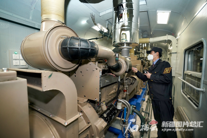 12月26日,「中國雪都·阿勒泰號」冰雪旅遊列車的發電車裡,列車工作人員正在例行巡檢三台300千瓦的發電機組,這可以保證列車全程不斷電。石榴雲/新疆日報記者 張萬德 攝