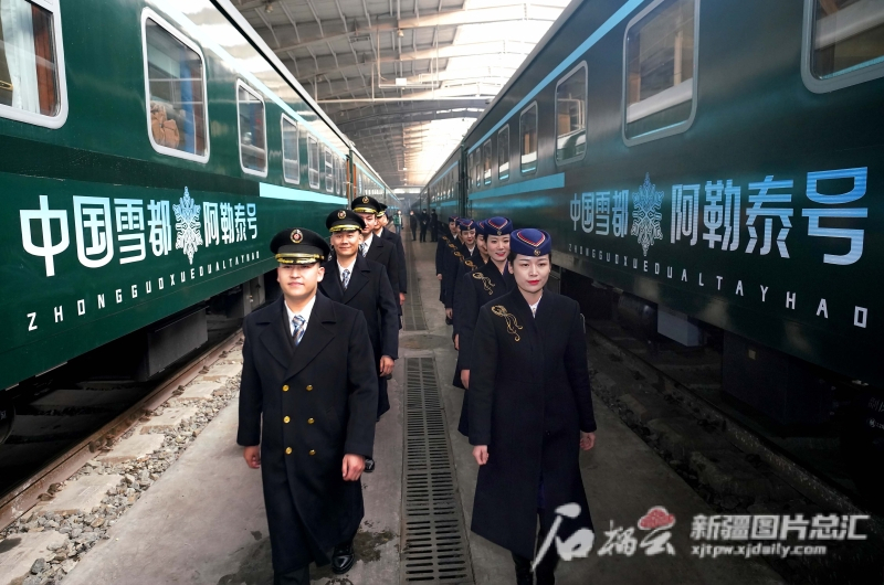 12月26日,在中國鐵路烏魯木齊局集團有限公司烏魯木齊車輛檢修基地,「中國雪都·阿勒泰號」冰雪遊列車全體列車服務乘員整裝待發。石榴雲/新疆日報記者 張萬德 攝