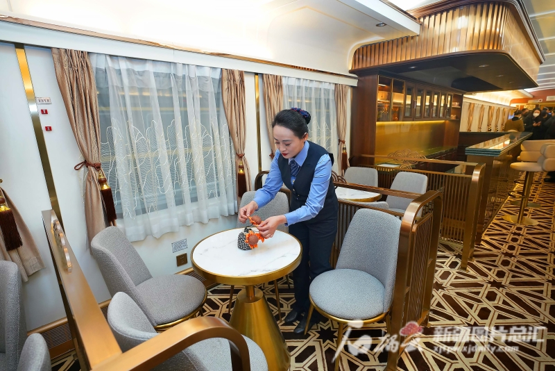 12月26日,「中國雪都·阿勒泰號」冰雪遊列車工作人員正在布置酒吧車車廂。石榴雲/新疆日報記者 張萬德 攝