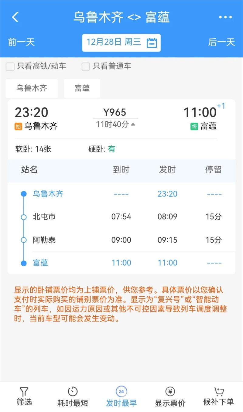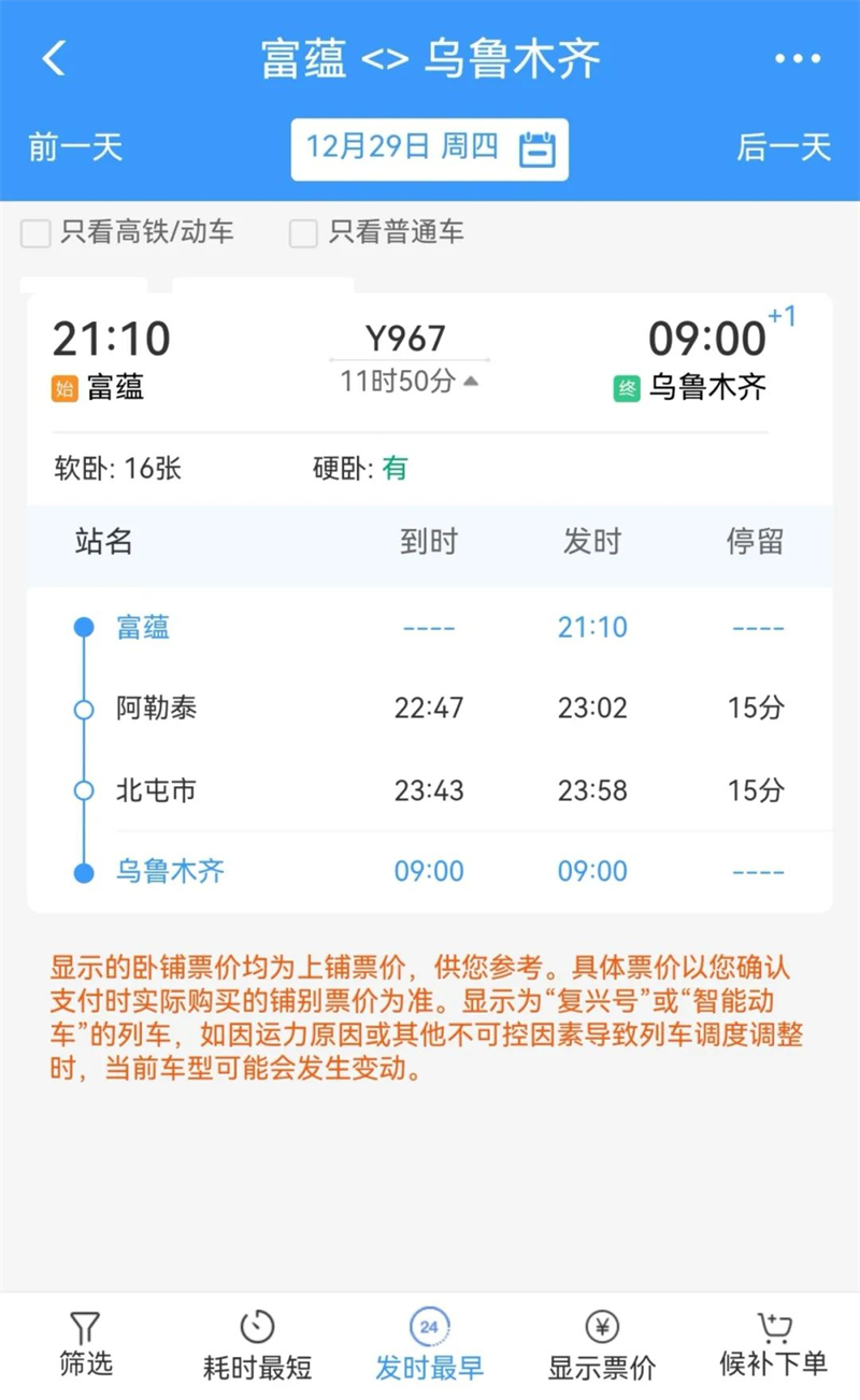 開行富蘊~烏魯木齊Y967/6次旅客列車