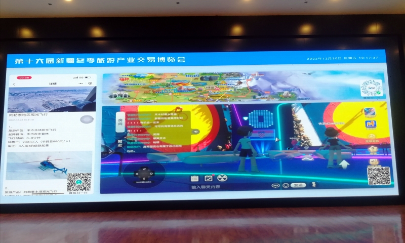 12月30 日,在第十六屆新疆冬季旅遊產業交易博覽會現場,一塊巨大的顯示屏上正在演示線上「雲冬博」內容。全新上線的阿勒泰地區全域旅遊電子地圖,吸引不少觀眾的目光。這份地圖不光可以提供導覽服務,還可為遊客提供在線預定吃住行等服務,在新疆屬首次推出。