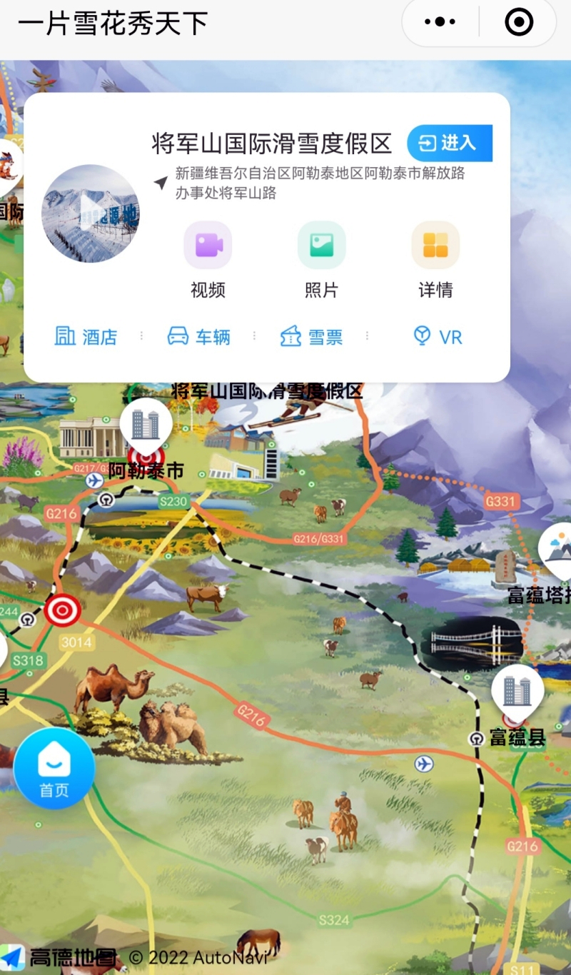 在微信裏輸入「智遊阿勒泰」,打開這款微信小程序,點擊下方的導遊導覽欄,在「一片雪花秀天下」板塊,阿勒泰地區全域旅遊電子地圖展現在眼前。這份電子地圖展現了阿勒泰地區6縣1市1景區的旅遊資源情況。點擊可可讬海國際滑雪度假區,關於這個景區的視頻、圖片、文字、語音等介紹一應俱全。不僅如此,這份電子地圖還可查詢當地酒店、車輛、雪票價格等信息,並可在線預訂。