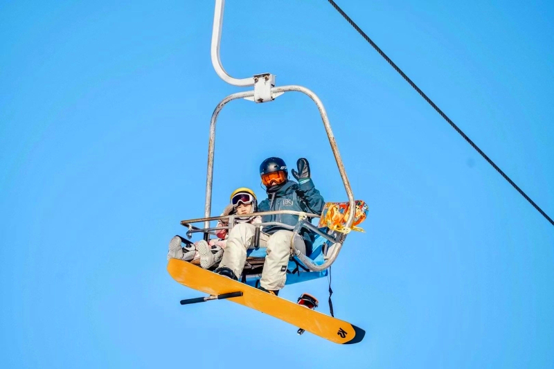 新疆絲綢之路國際度假區,單板教練帶着小學員乘坐纜車。(資料圖)