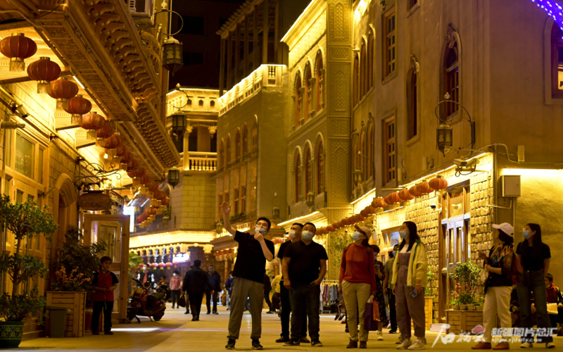 遊客夜遊和田團城,觀賞團城夜景。石榴雲/新疆日報記者 湯永攝