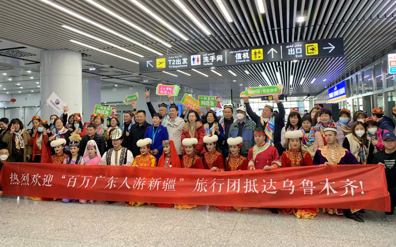 3月6日,「百萬廣東人遊新疆」首航旅行團接機歡迎儀式在烏魯木齊地窩堡國際機場T2航站樓舉行,來自深圳的36名遊客將在新疆開啟為期8天的旅程。