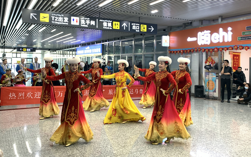 3月6日,演員們在「百萬廣東人遊新疆」 首航接機儀式上表演。