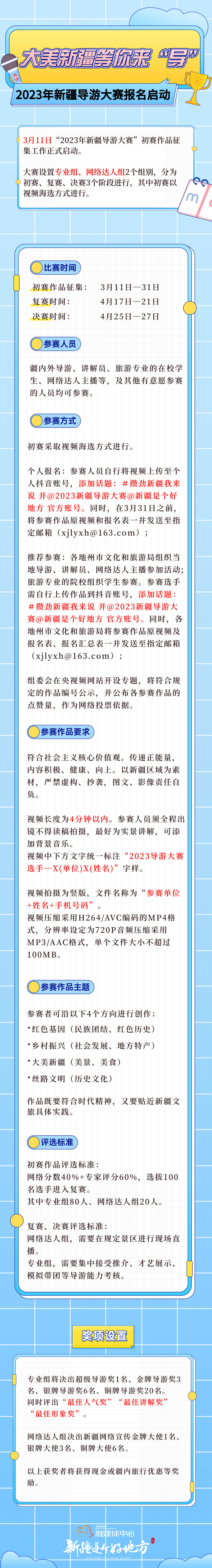 具體賽程設置、作品要求、評選方式,請參見新疆文化和旅遊廳官方網站相關內容。