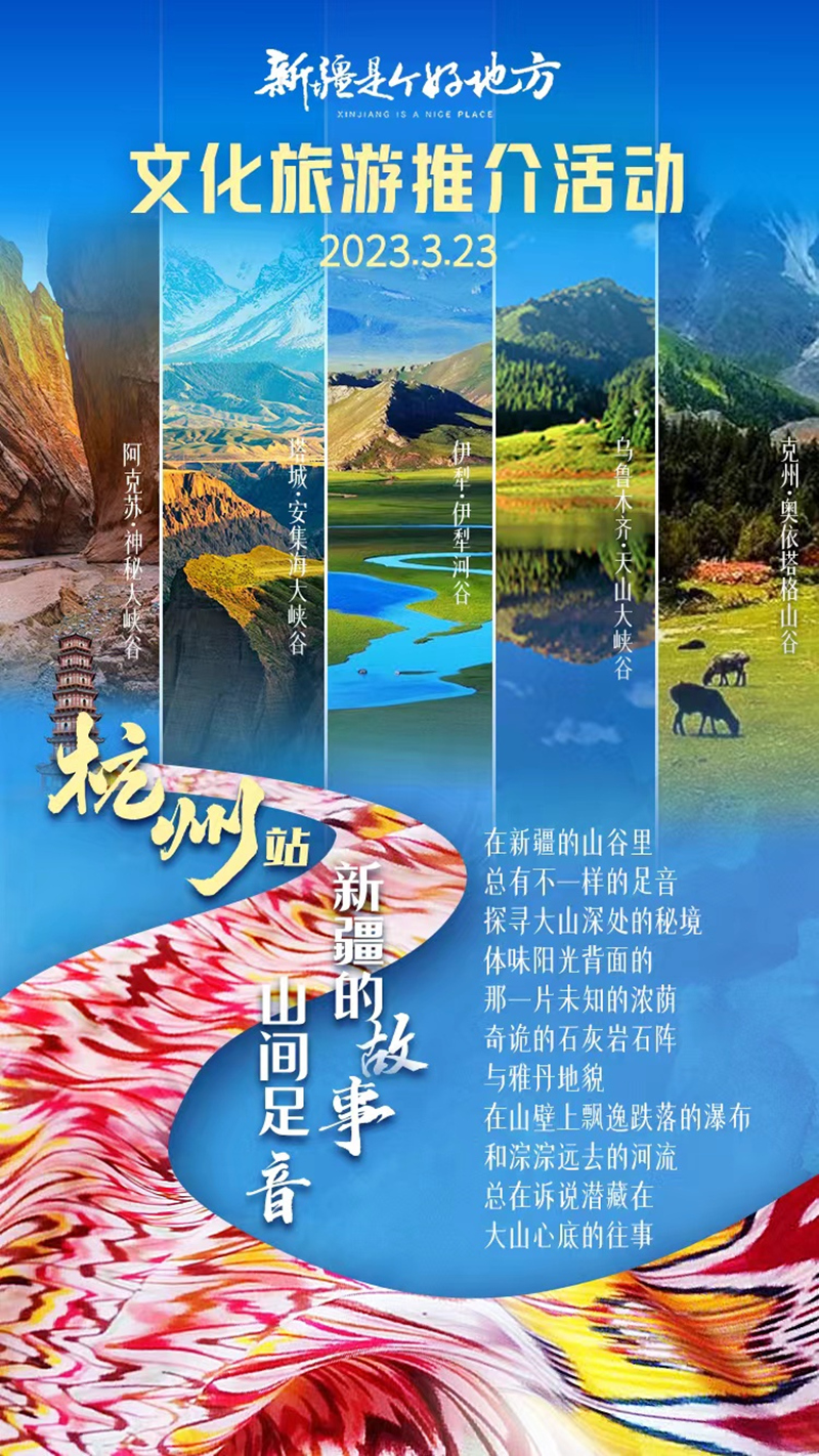 3月23日,「新疆是個好地方」赴全國四省一市文化旅遊推介活動將走進浙江省杭州市,屆時新疆阿克蘇地區、伊犁哈薩克自治州、和田地區、塔城地區、烏魯木齊市、克孜勒蘇柯爾克孜自治州、克拉瑪依市、昌吉州等8地州(市)進行文化旅遊推介,與此同時還有兩地旅行社洽談會、主題展、「一起來跳新疆舞」等多項精彩的活動。