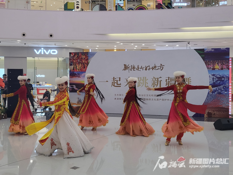 3月23日,「一起來跳新疆舞」進廣場聯誼活動現場,演員正在演繹《朱拉》。石榴雲/新疆日報記者阿比拜攝