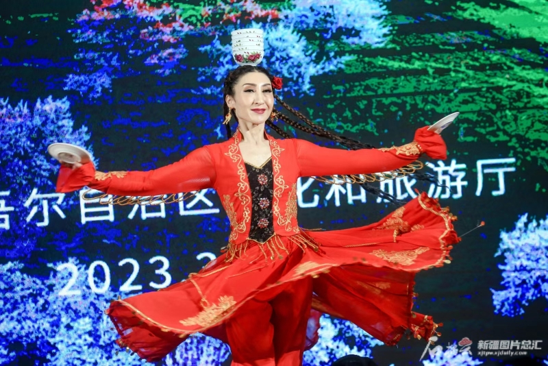 3月26日,「新疆是個好地方」文化和旅遊推介會南京站現場,演員正在表演《頂碗舞》。石榴雲/新疆日報記者 阿比拜攝