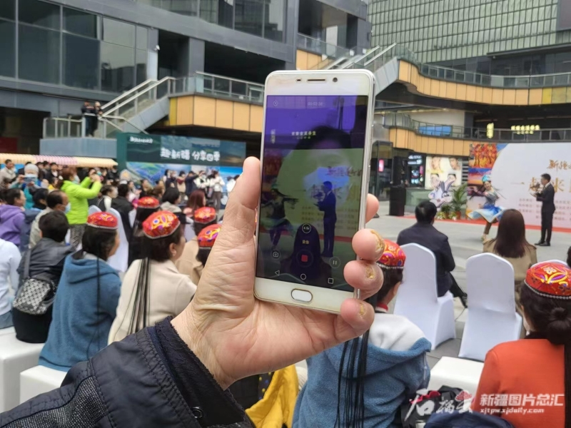 3月29日,上海市楊浦區萬達廣場前,「一起來跳新疆舞」進廣場聯誼活動現場,路過的市民正在定格這一畫面。石榴雲/新疆日報記者 阿比拜攝