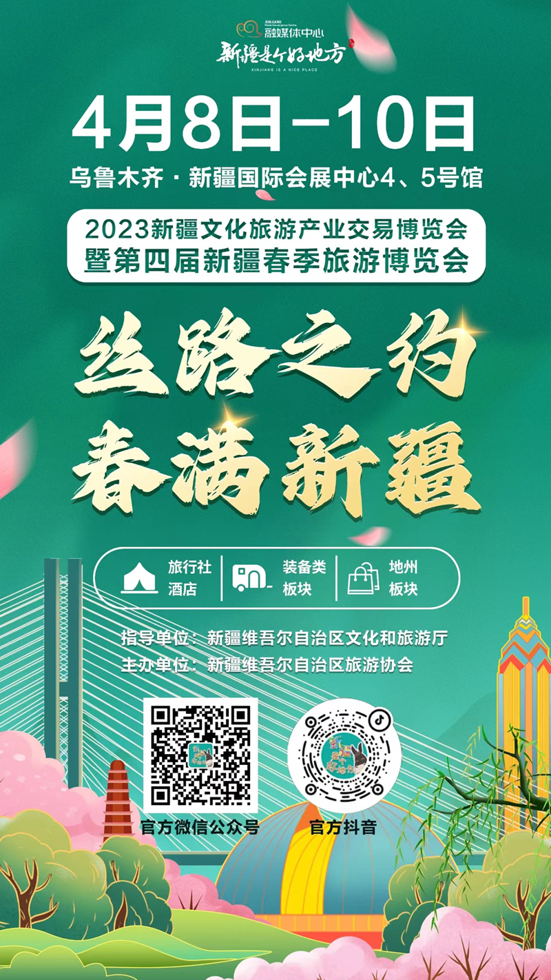 為推動新疆旅遊行業的特色化、現代化、低碳化發展,推動新疆旅遊產業與各兄弟省(區)市的交流合作,由新疆旅遊協會、新疆旅行社協會、新疆生產建設兵團旅遊協會、新疆導遊協會共同主辦的新疆文旅產業交易博覽會於2023年4月08-10日在烏魯木齊舉辦,同期舉辦新疆文旅產業發展高峰論壇暨新疆春季文化旅遊資源對接會。