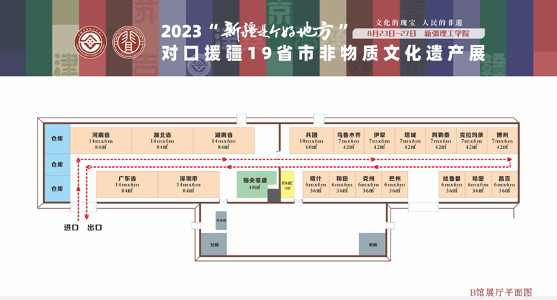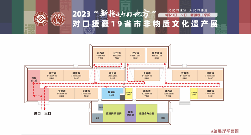 展會主展區新疆理工學院展覽面積為7850平方米,室外總展示面積3350平方米,室內總展覽面積4500平方米。展區由序廳、展覽展示和特色非遺活動三大板塊組成。