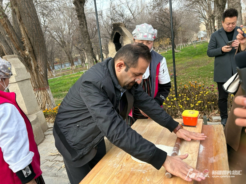 伊朗旅遊市場局總局長慕斯裏姆·沙賈裏在察布查爾錫伯自治縣錫伯古城體驗製作錫伯大餅。