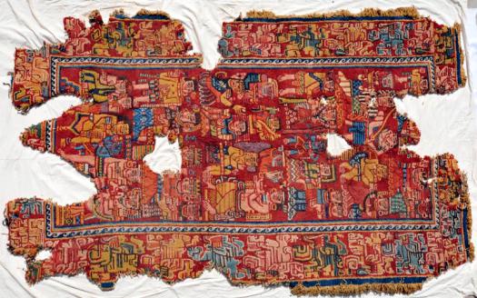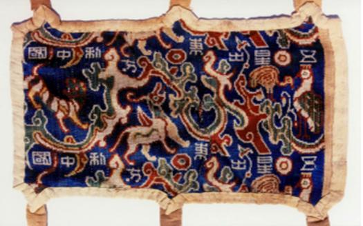 016-隋代栽絨毯 隋代(581—618年)的栽絨毯,以棕白色合股毛絨為經,灰白色合股粗毛絨作地緯,經、緯線交織成一上一下的平紋組織
