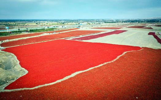 新疆安集海鎮辣椒曬場: 豐收時節裏的紅色畫卷 9月24日,新疆沙灣市安集海鎮的辣椒曬場上,火紅的辣椒如同給大地鋪上的紅色地毯