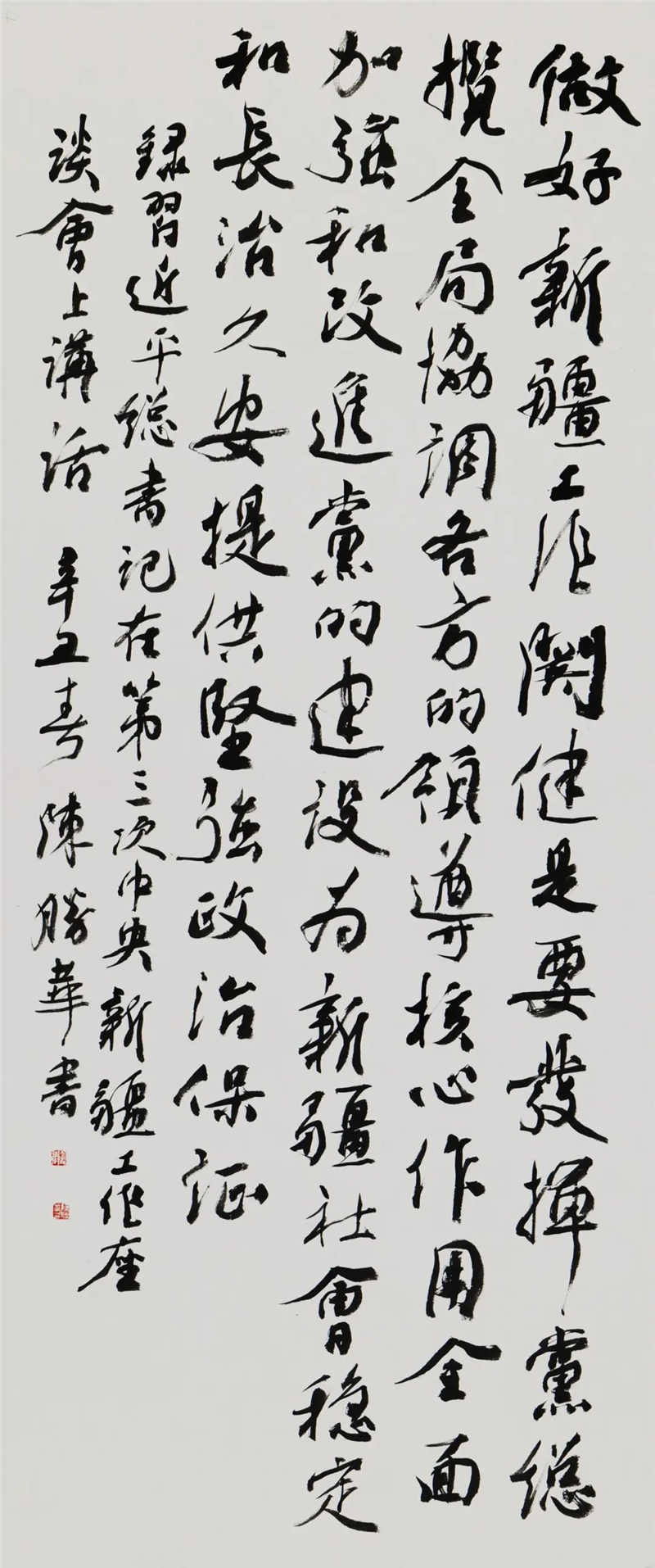 「雨潤天山——第十批援疆慶祝建黨100周年主題書法展」是文化潤疆的生動實踐,是向中國共產黨成立100周年的崇高獻禮。回顧黨的百年光輝歷程,展望新疆發展光明前景,讓我們把慶祝活動激發的精氣神轉化為實現新疆社會穩定和長治久安總目標的強大動力,完整準確貫徹落實新時代黨的治疆方略,奮進新征程、建功新時代,推動黨的治疆事業和援疆工作不斷開闢新局面、取得新成效!