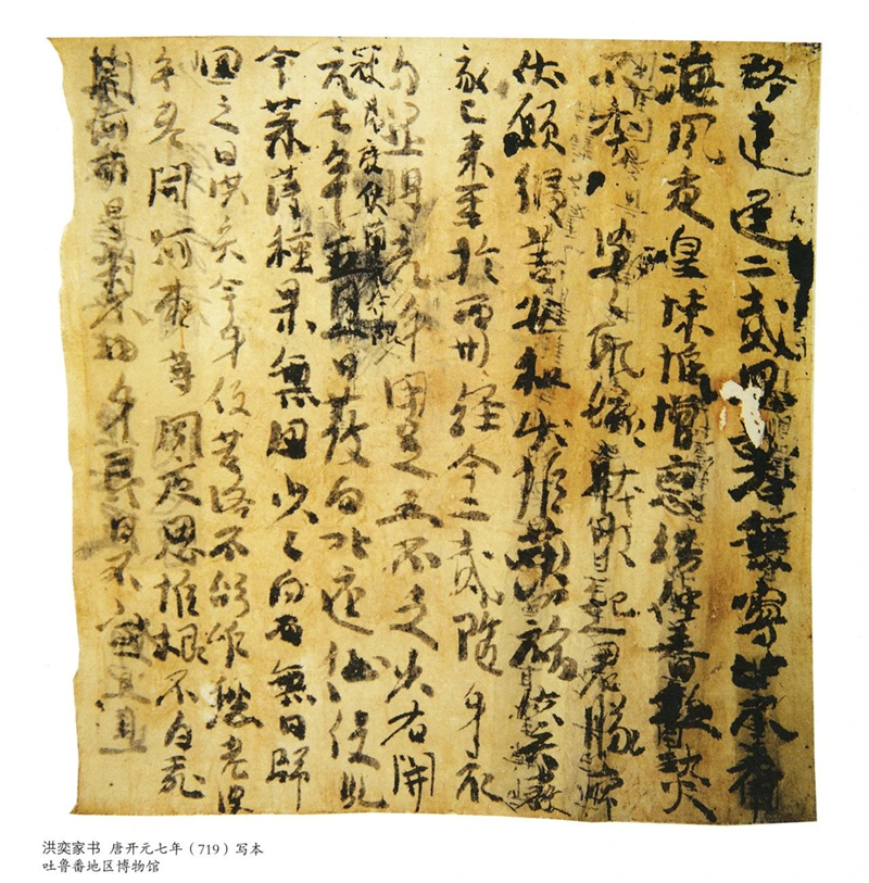 《洪奕家書》,2004年吐魯番阿斯塔那396號唐墓出土,唐開元七年(719年)寫本。文書雙面書寫,正面為一份官文書,背面為一封家書,因其寫信人自稱「洪奕」,故定名為《洪奕家書》。洪奕是唐代西北邊塞士兵,離家來到西州(今吐魯番)已兩年,思鄉心切,寫信問候家中爹娘起居安好。該家書為研究開元時期戍邊將士的情況提供了重要參考。