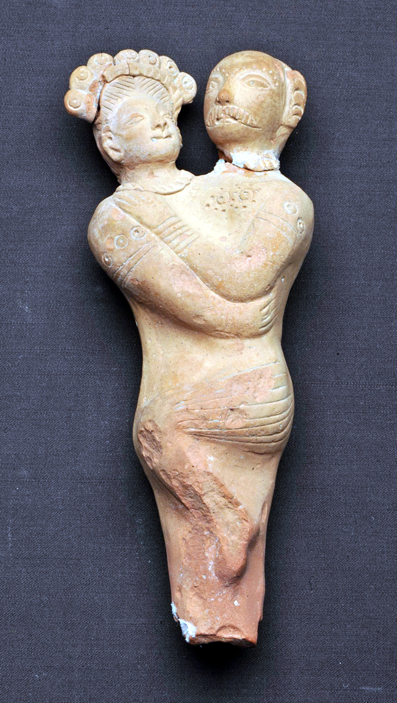唐代(618—907年)的紅陶人像,出土於策勒縣達瑪溝區域,為手工泥質紅陶,形象為一男一女作相擁狀,男子腿部蜷曲纏於女子身上,用針剔手法表現出二者的面部和毛髮,男性鬚髮捲曲,女性面帶微笑,與約特乾地區出土陶俑在技法上一致。目前收藏於和田地區博物館。