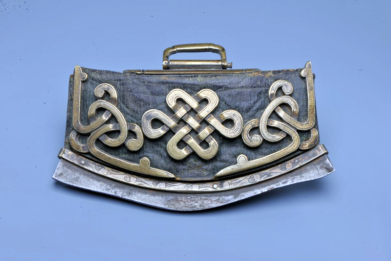 清代(1616—1911年)的黃銅火石袋,整體呈斧狀,背部較厚,並設有一個方形環紐,用於日常佩戴;另一端較銳薄,表面裝飾有類似中國結形的紋飾。火石袋是用於盛裝火石的小袋,一般為布制,這種金屬質地的可能除了裝納火石的功能還可用來與火石摩擦起火。這種體型較小的火石袋,可能是用於日常抽煙所用,上面的紐應是便於懸掛在煙斗或煙桿之上所用。