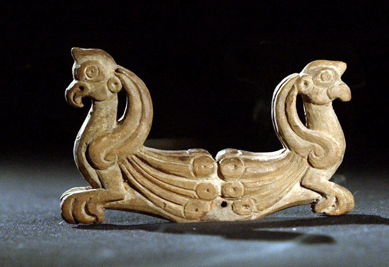 此處展覽的這件雙頭連體鳥木雕的時代為漢晉時期,此時,佛教及印度文化早已影響西域。在印度佛教中這種雙頭連體鳥稱為共命鳥,在中國先秦史籍中則稱比翼鳥,可以肯定這件製作精美木雕無疑蘊含了其主人對於吉祥寓意的期盼和這個時代諸多文明因素在和田的匯聚。